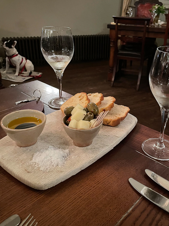 Drinking snacks, and a very well-behaved pooch